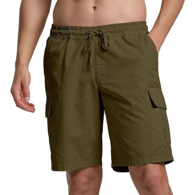 Mens 10 Inch Inseam Cargo Shorts Cotton Drawstring Elastic Waist Hiking Work Shorts with 6 Pockets