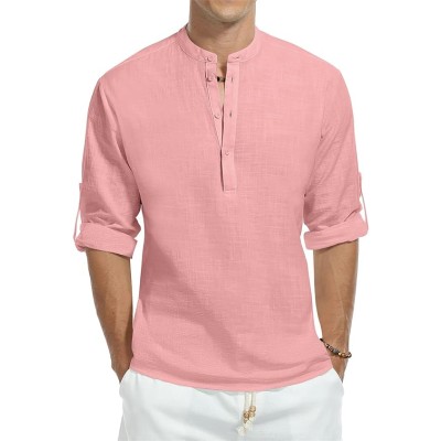 Men's Linen Shirts Long Sleeve Button Down Henley Shirts Casual Solid Band Collar Beach Shirt