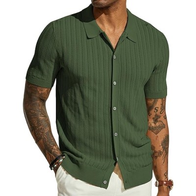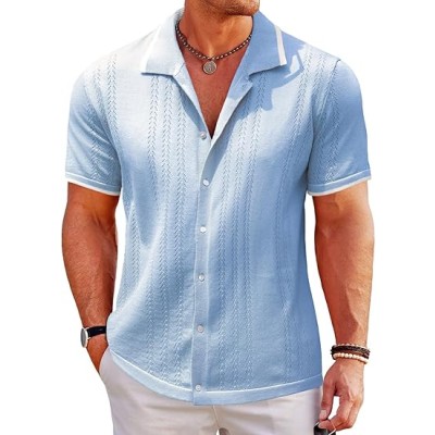 Men's Knit Button Down Shirt Short Sleeve Vintage Shirts Breathable Summer Beach Tops