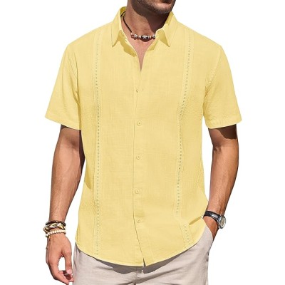 Mens Linen Shirts Short Sleeve Button Up Casual Lightweight Solid Shirt Stylish Cuban Guayabera Beach Tops
